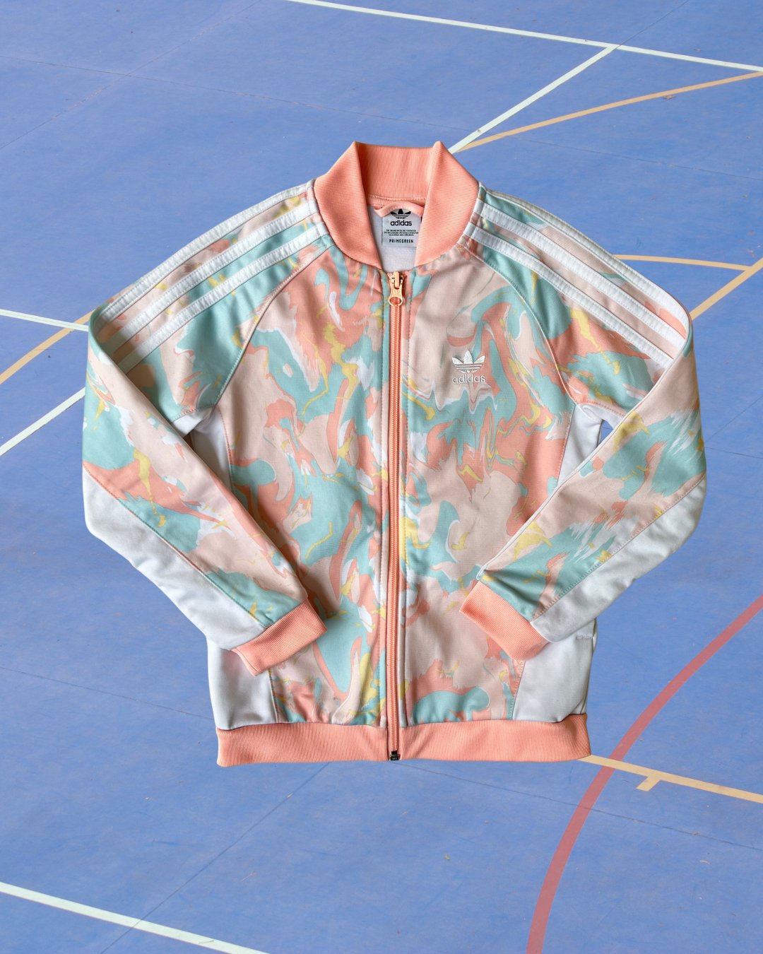 What a fun, abstract pattern on a classic Adidas track jacket. Perfection! 100% recycled poly.