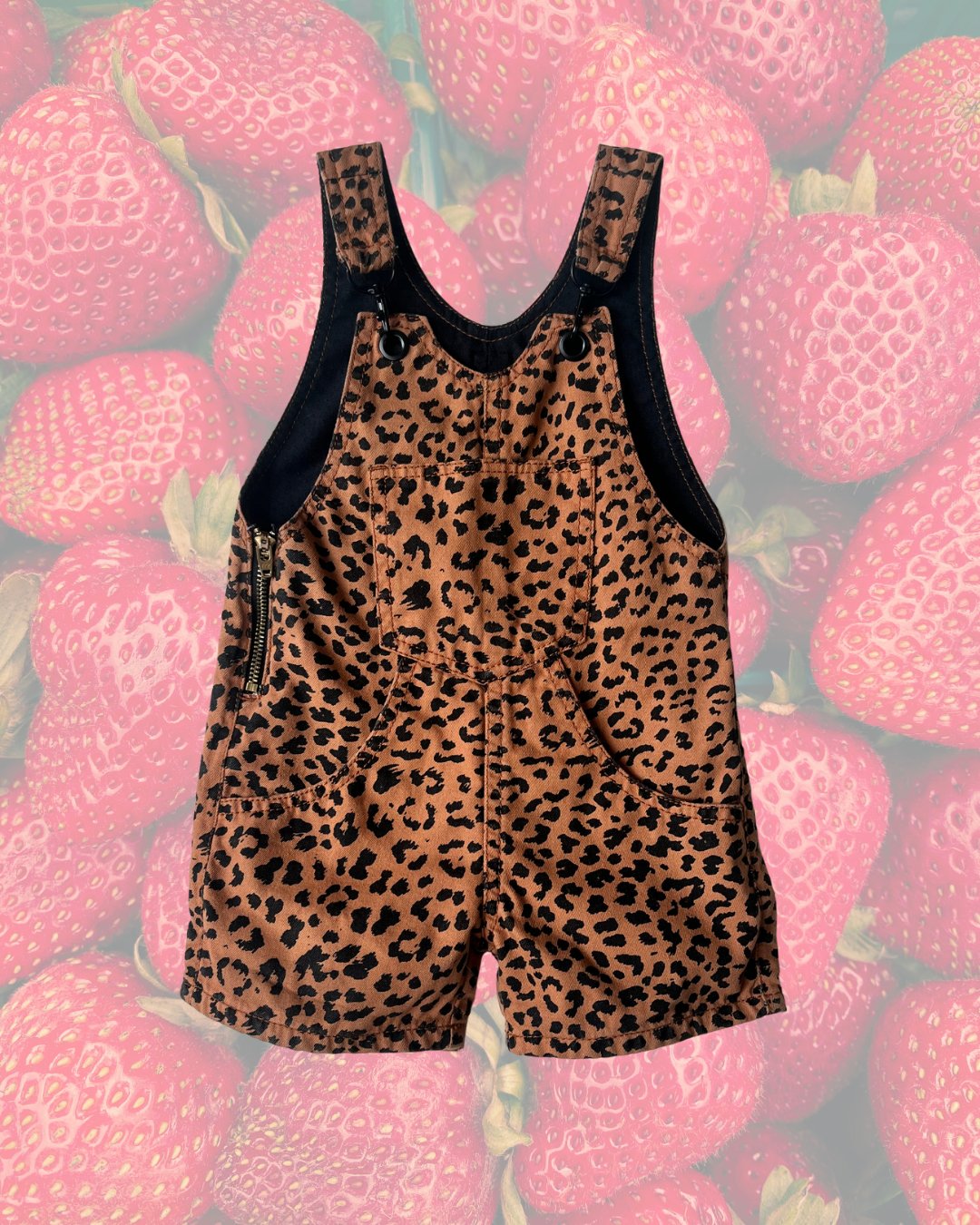 Cheetah print short overalls from Tales & Stories, adorable! Clasp closure straps and size zipper.