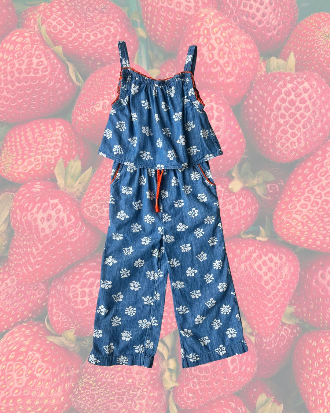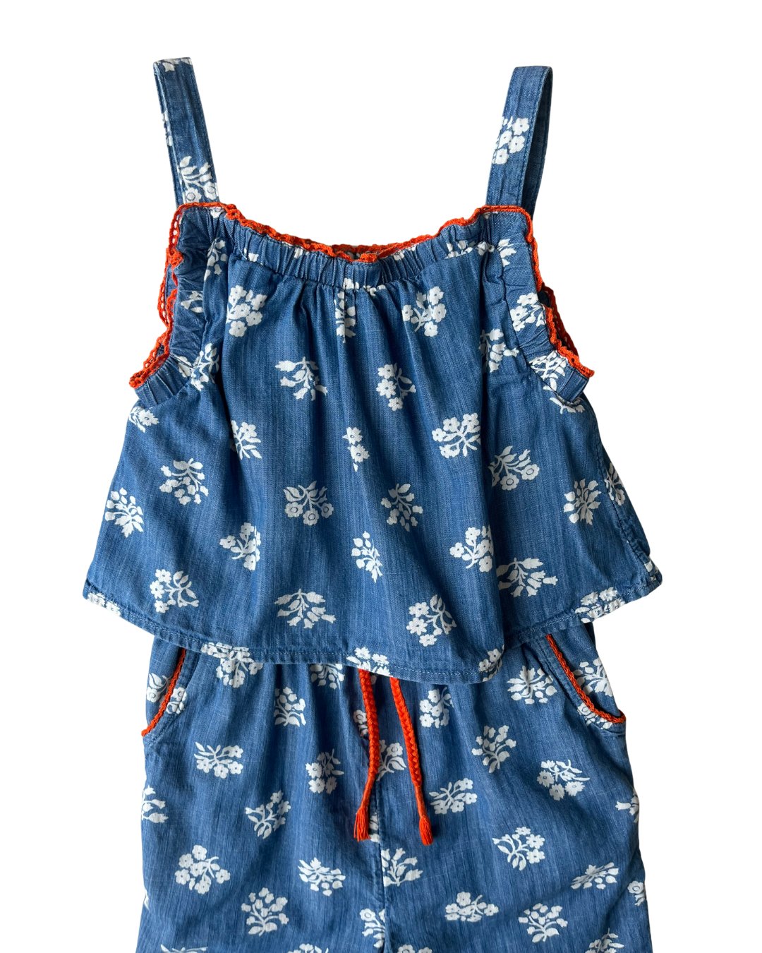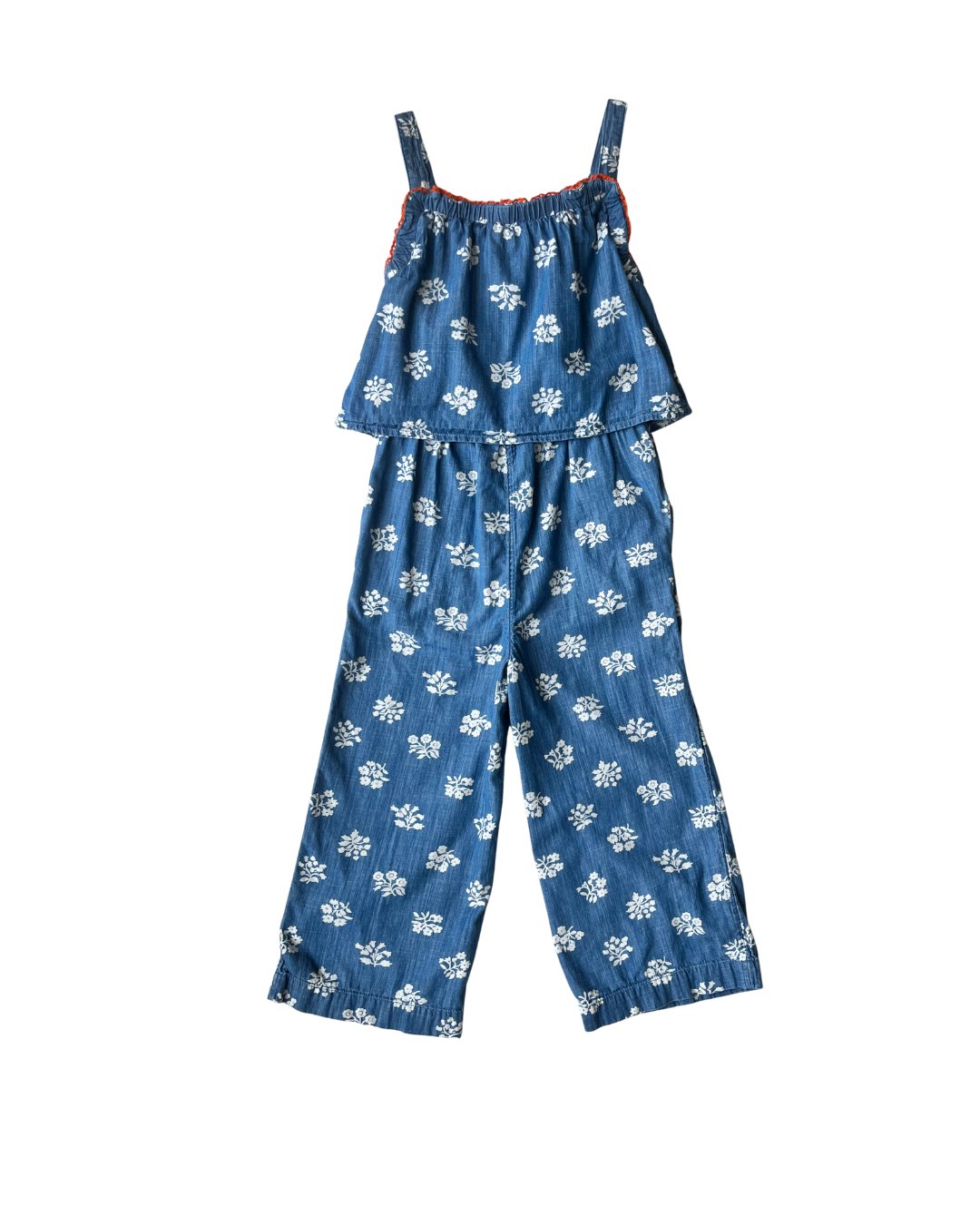 Chambray jumpsuit with printed white flowers and orange trim detailing from Boden. 100% cotton.