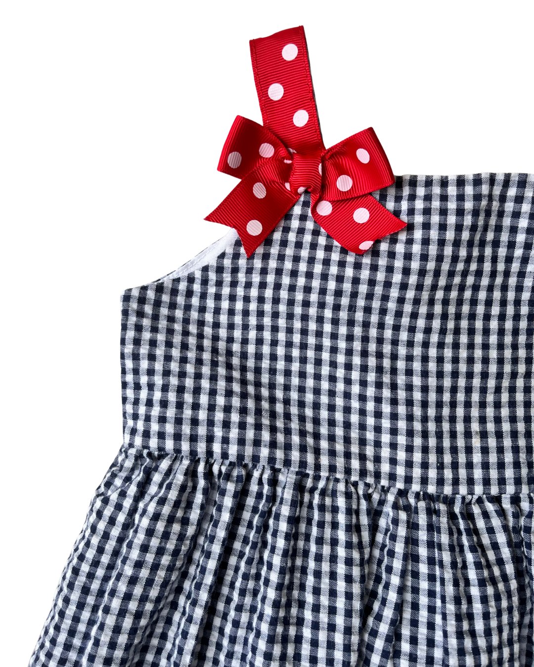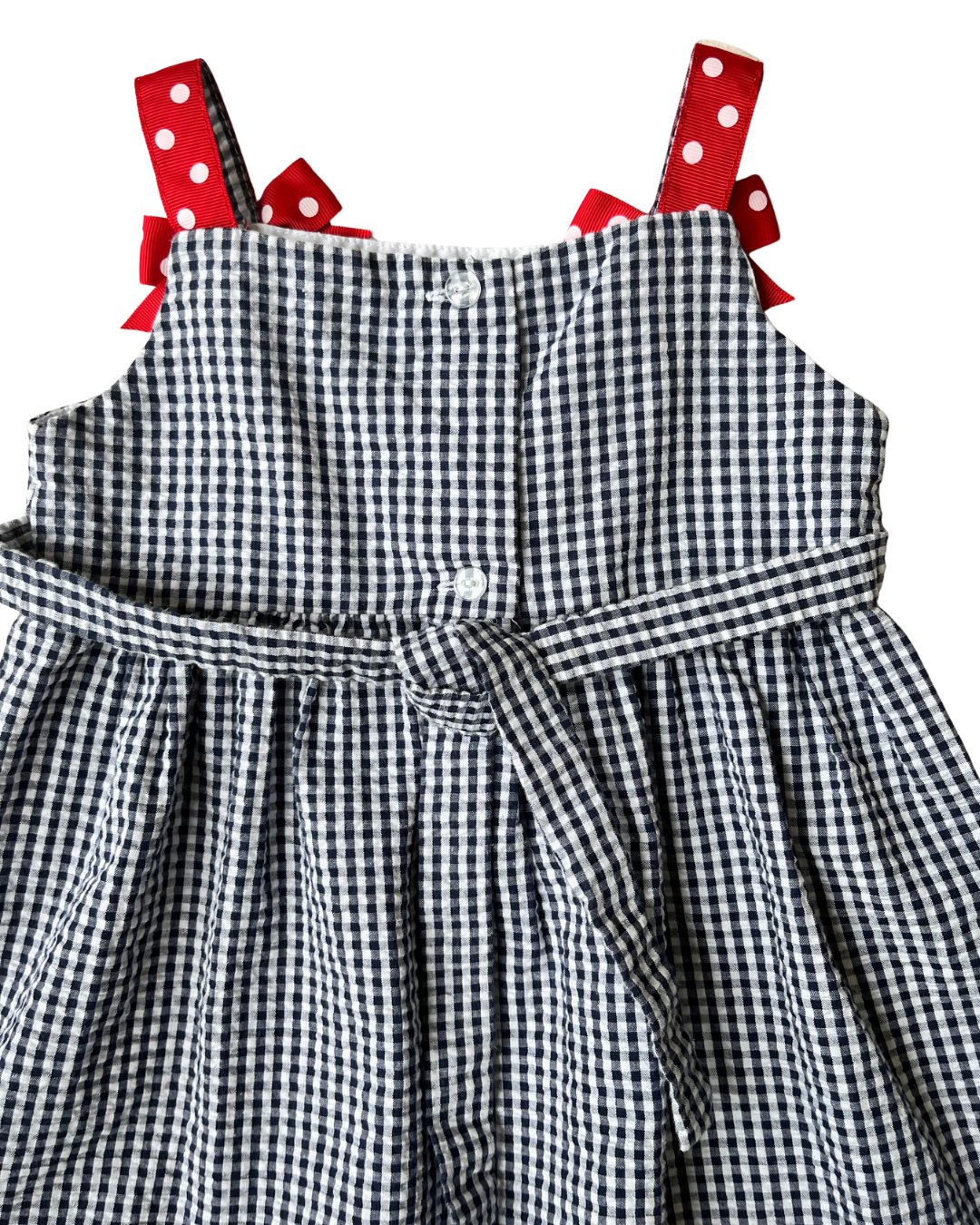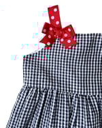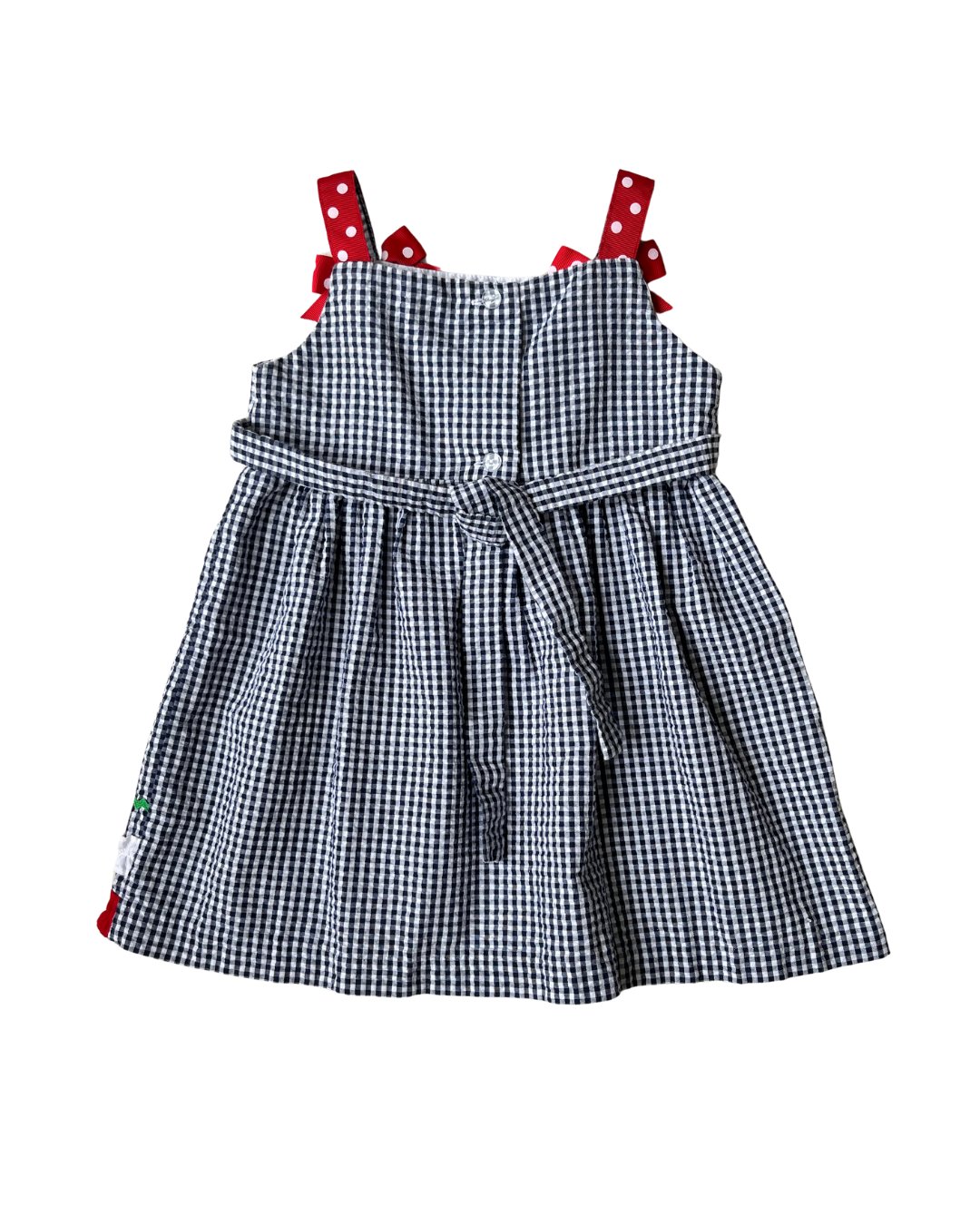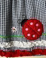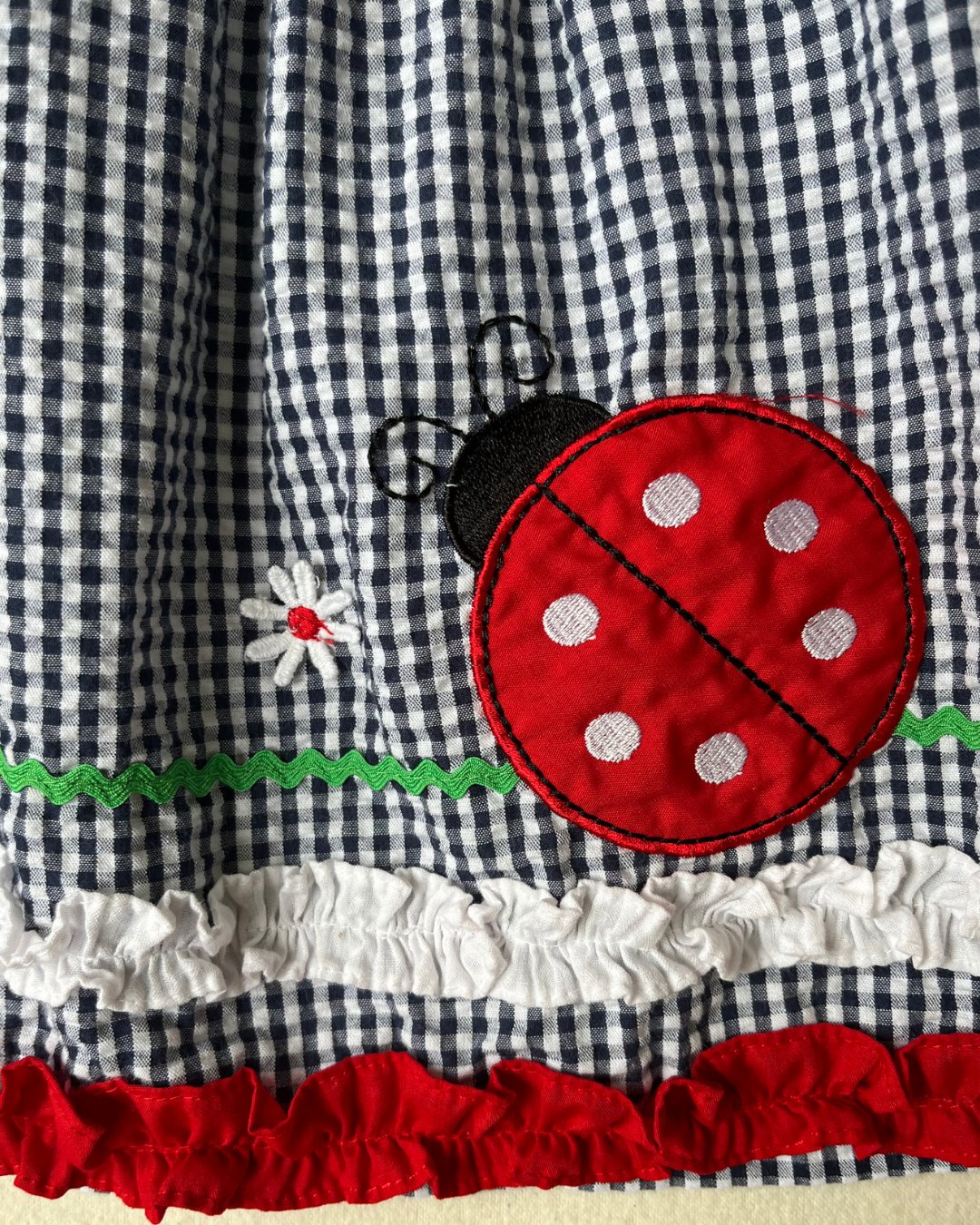 Adorable ladybug checkered dress with fun little details! 55% cotton, 45% poly.
