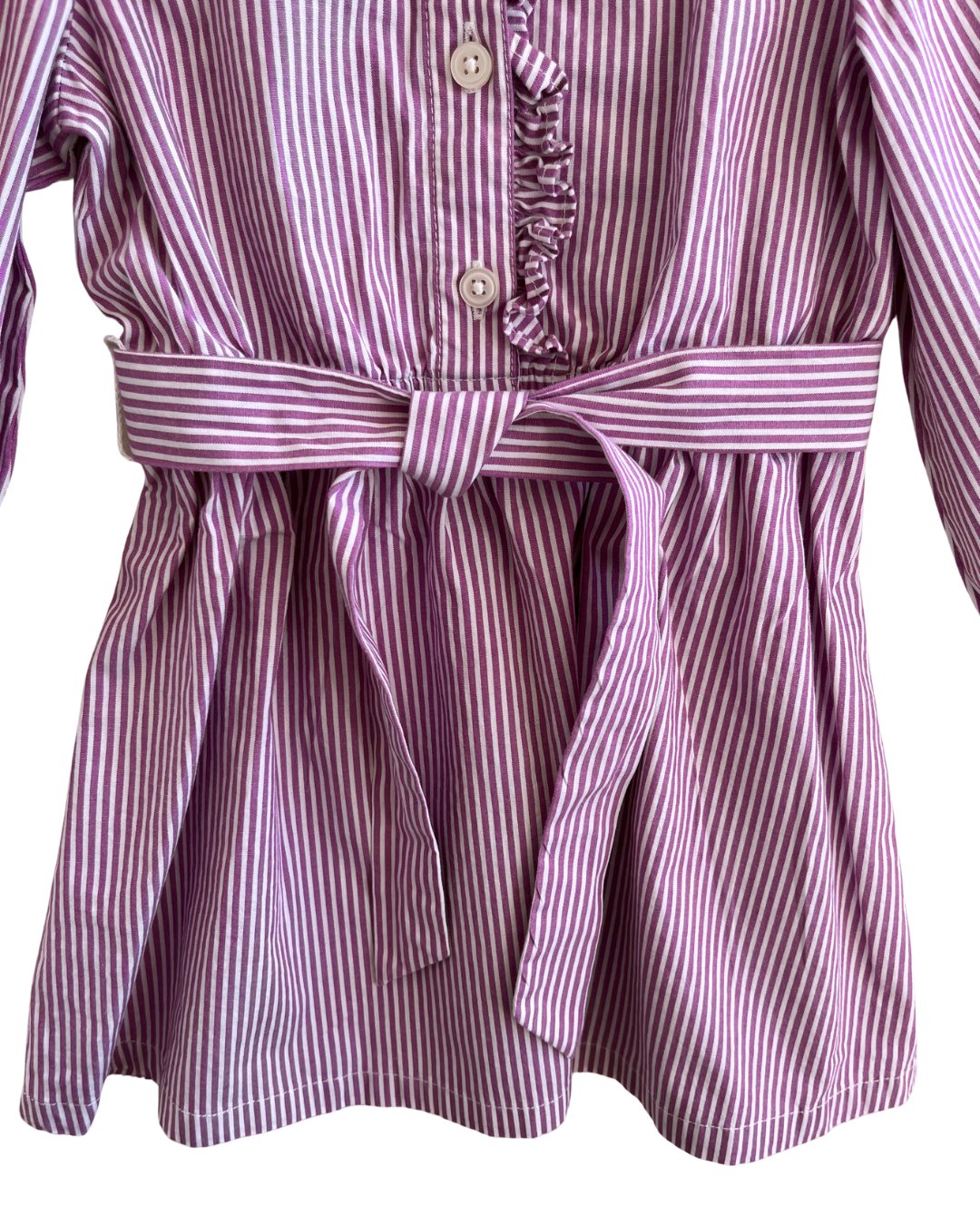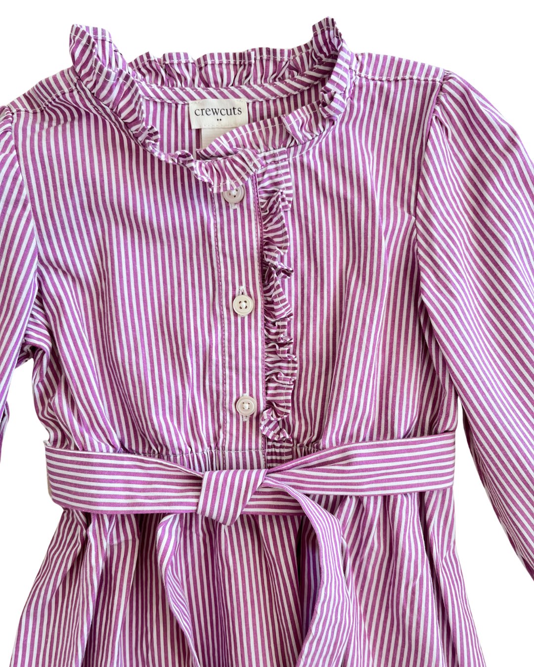 Purple striped Crew Cuts, by J. Crew, dress with ruffle details on neck, sleeves and buttons. Elasticated waist with a detachable tie. 98% cotton, 2% elastane.