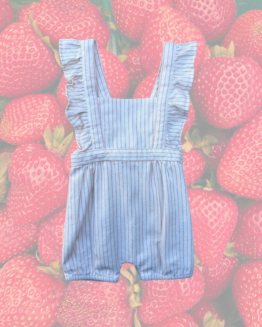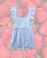 Darling ruffle sleeve Hallmark Baby romper, 3 size adjustable strap lengths. No tag size, estimating at a 3m size. 86% cotton, 9% poly, 3% elastane.