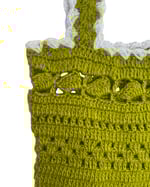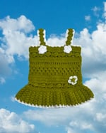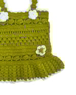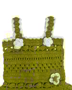 This olive green crocheted peplum hem dress is so cute! Handmade and embellished with flowers. No size, please refer to our measurements. Estimating it at 9-12m, see measurements. Acrylic.