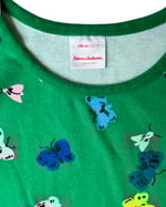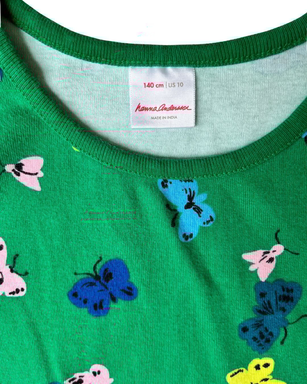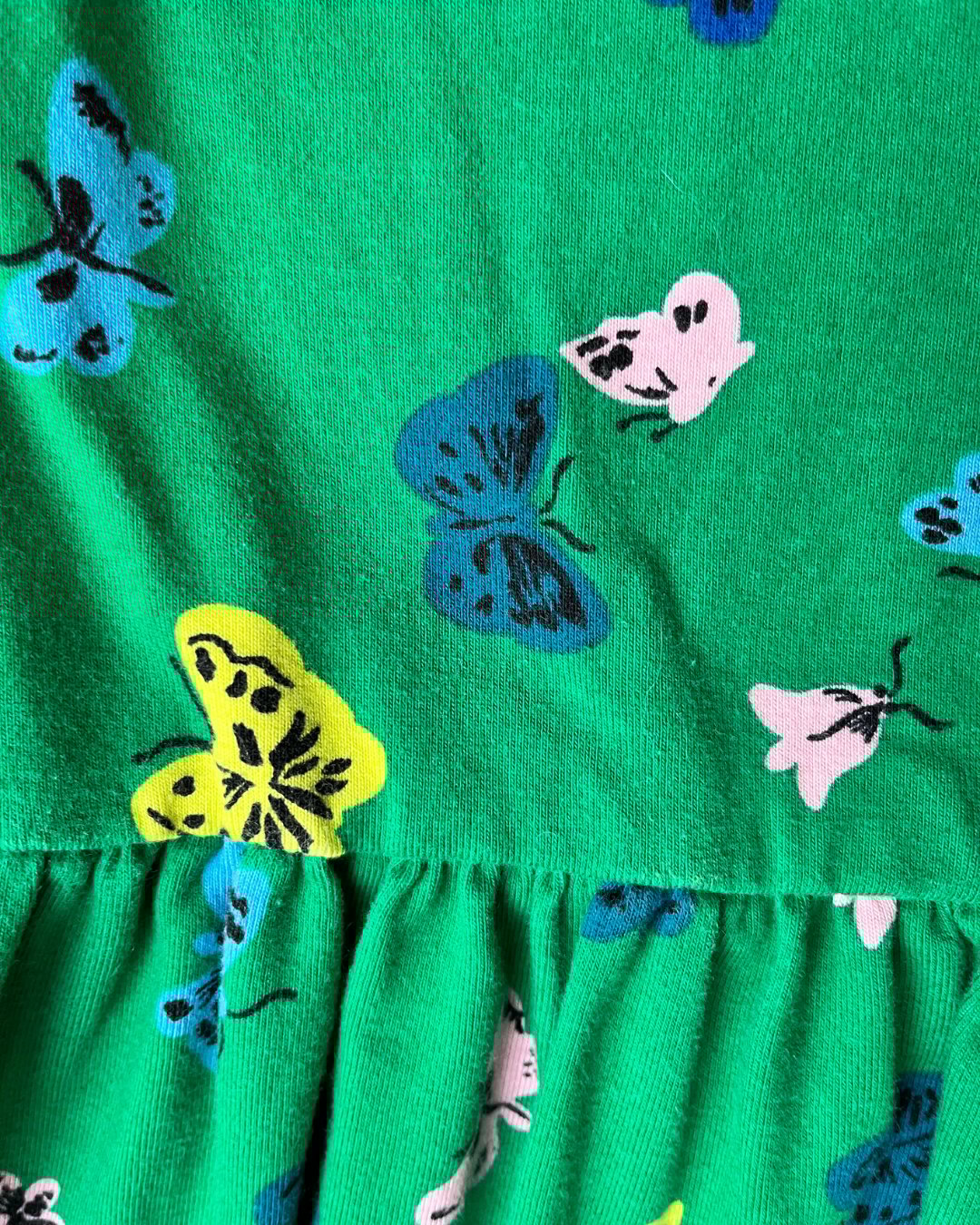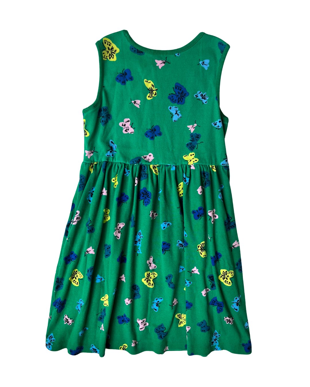Green butterfly patterned Hanna Andersson dress with pockets! Structured jersey cotton. 100% organic cotton.