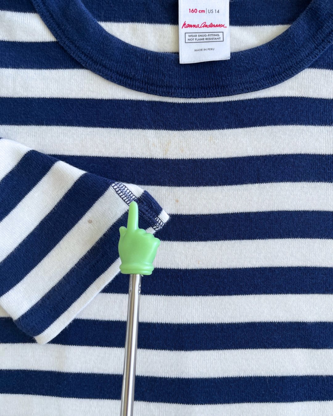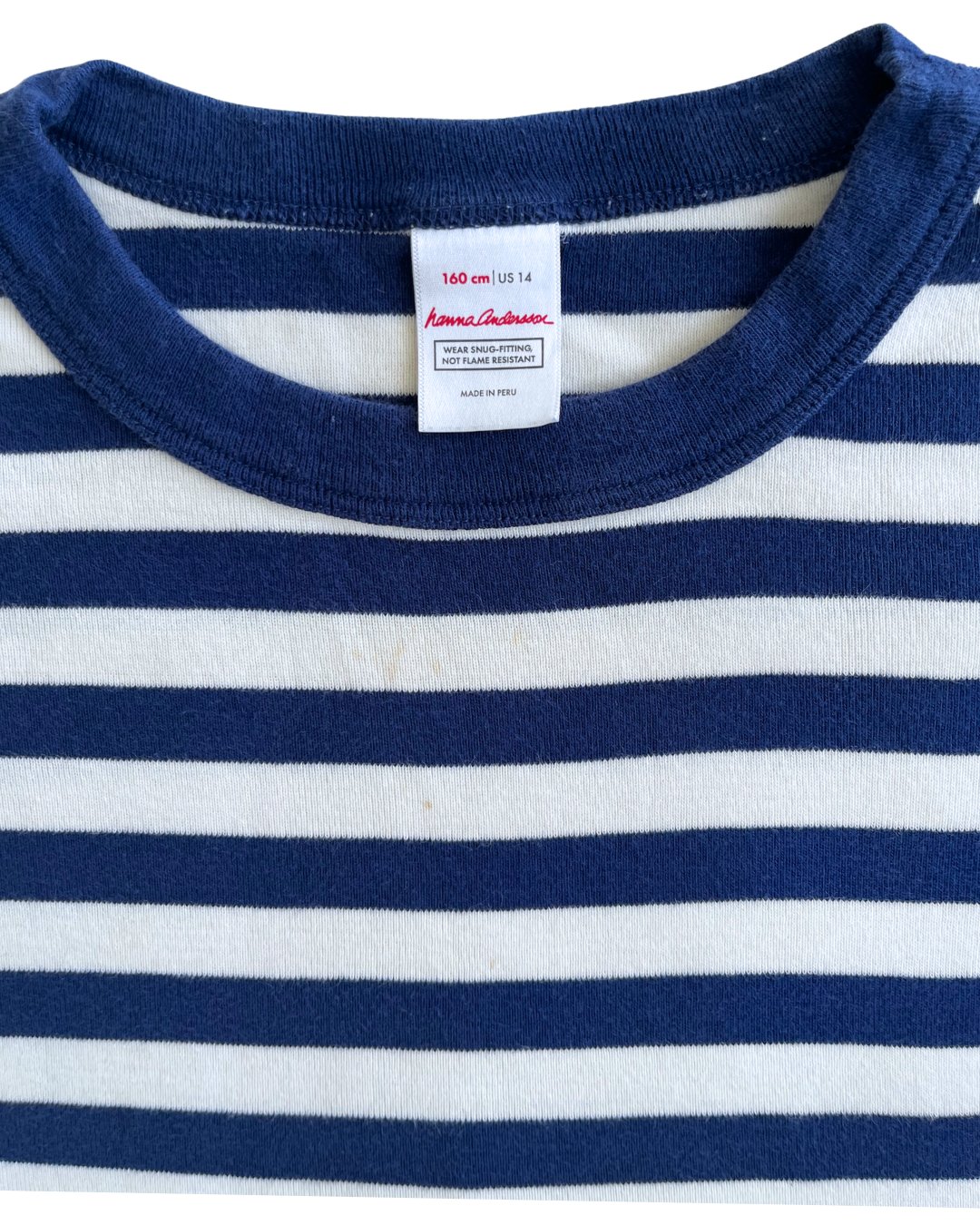 Thick cotton navy striped Hanna Andersson t-shirt, a solid, quality basic. Faint staining on front and sleeve, see photos. 100% cotton.