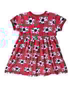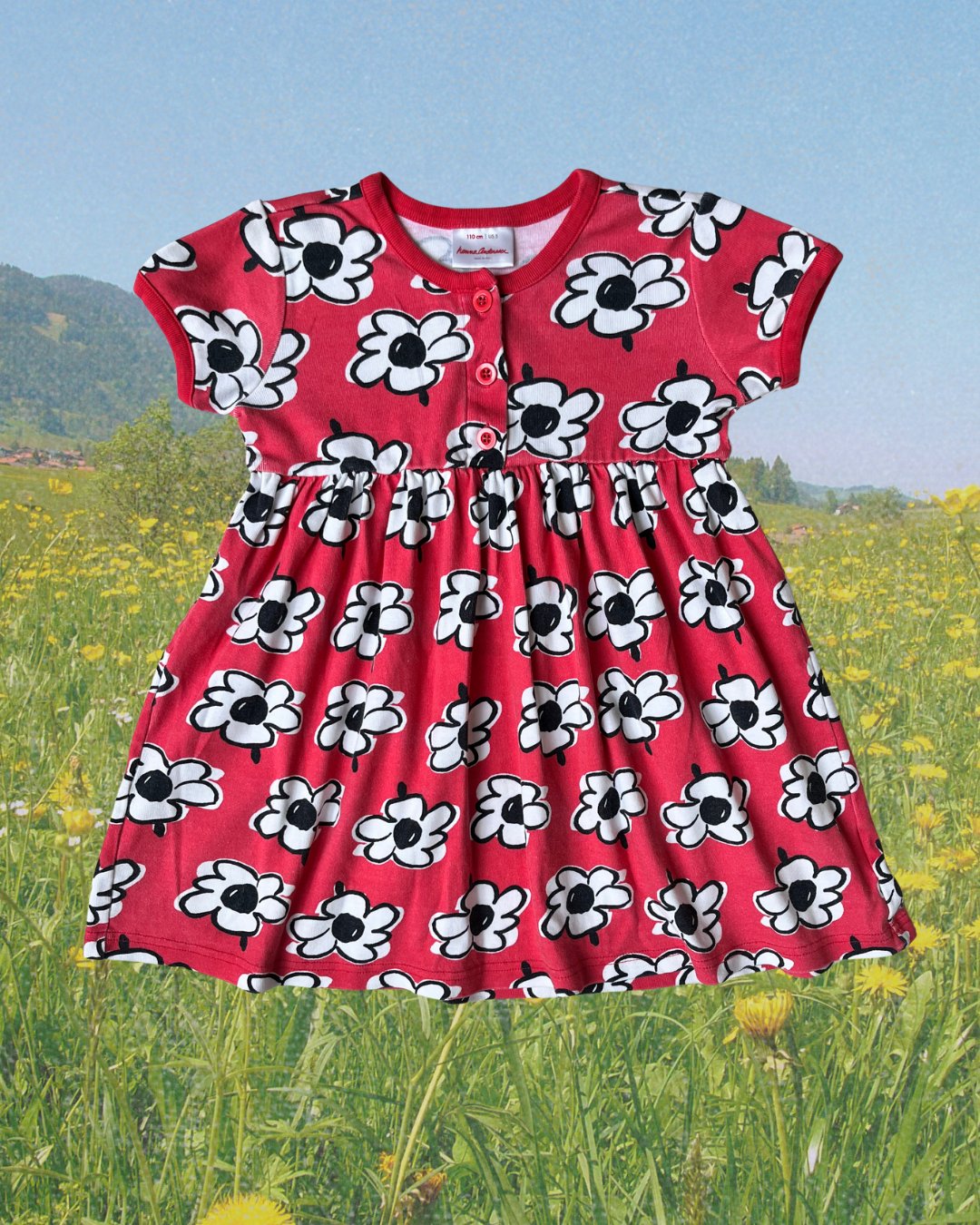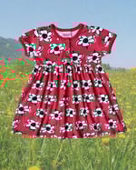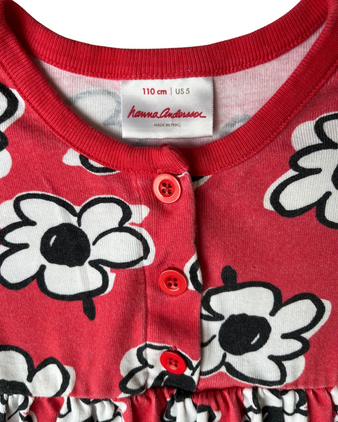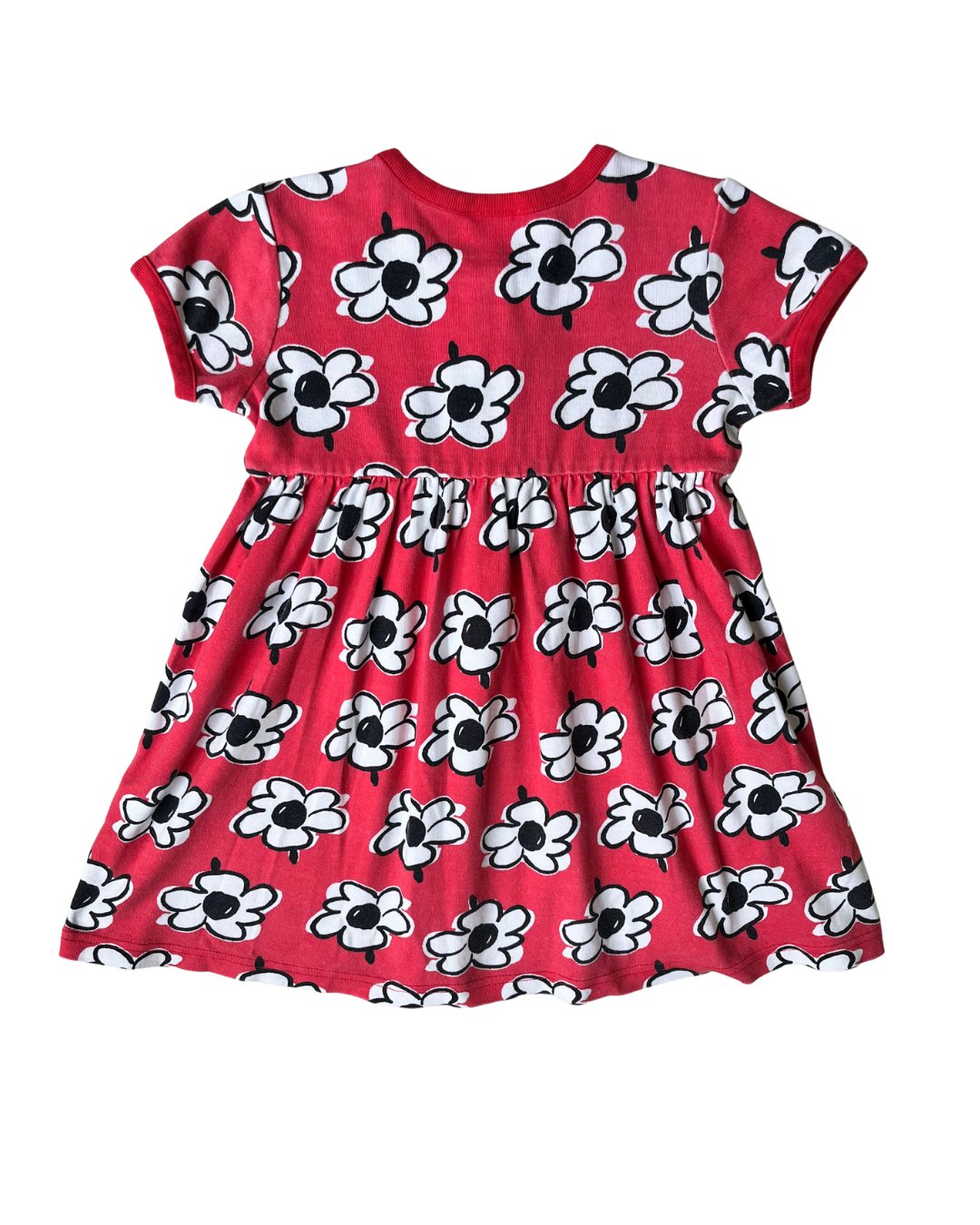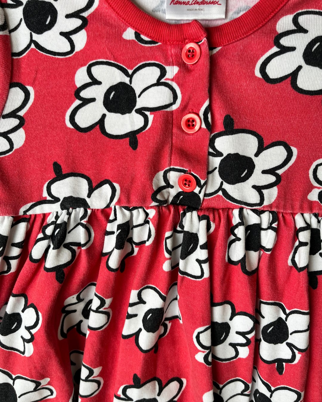 Coral red Hanna Andersson stretchy jersey cotton dress with white floral patterning. 100% cotton.