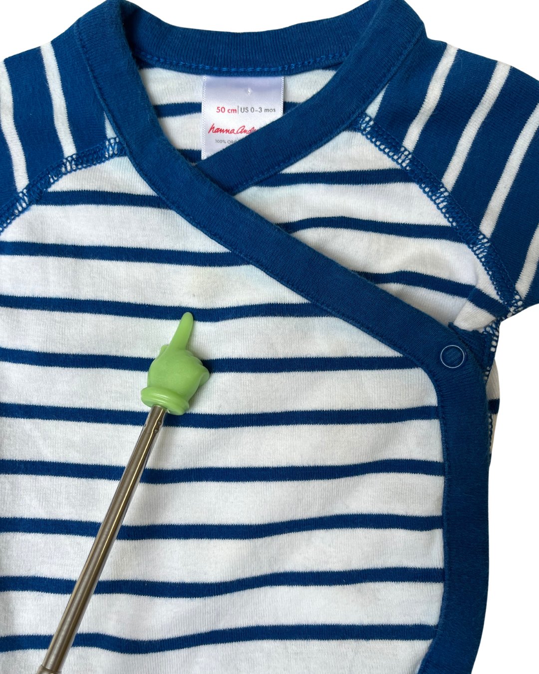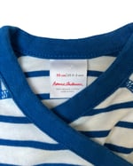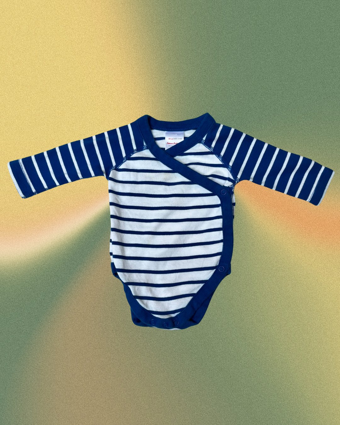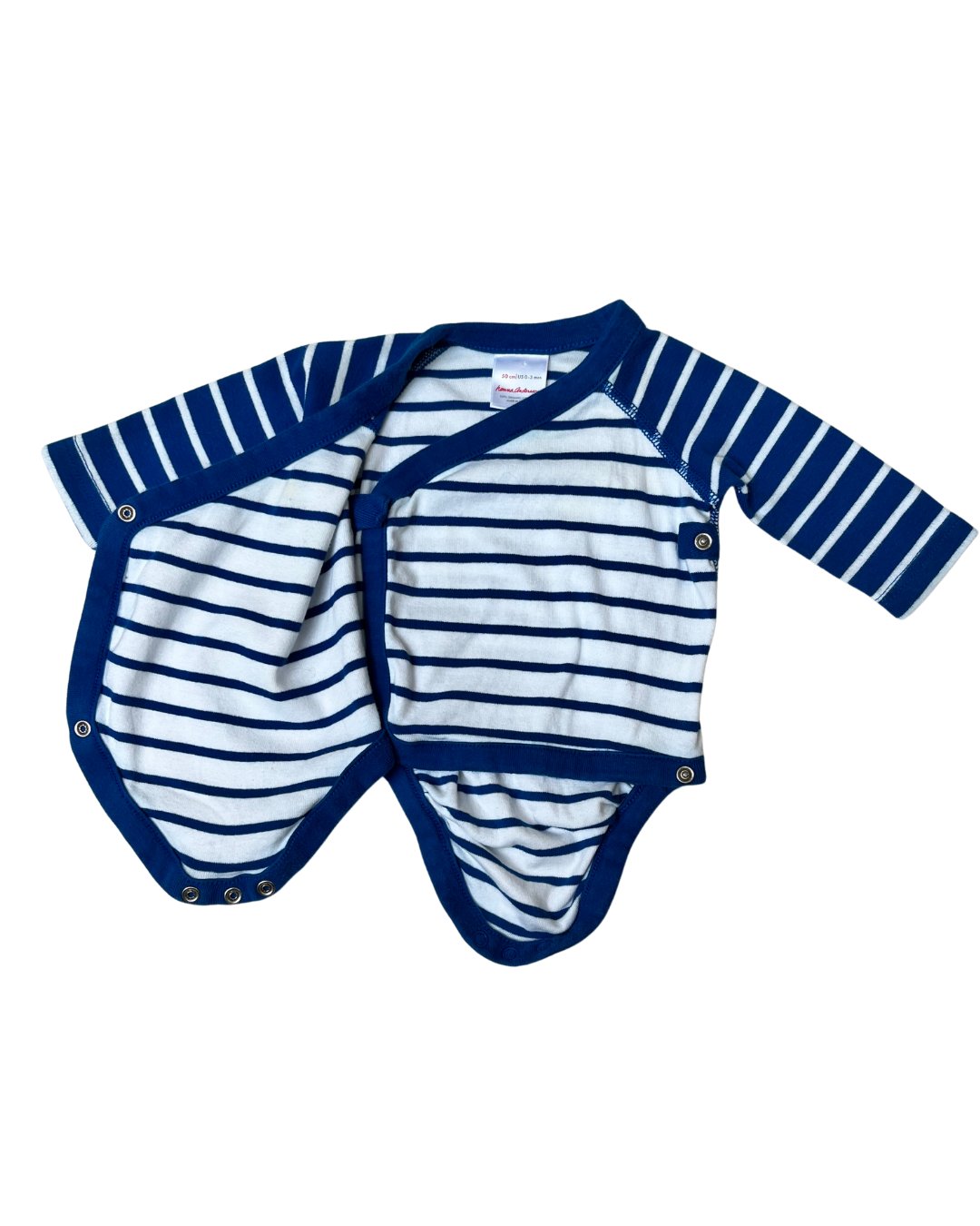 Wrap-style onesie from Hanna Andersson in a classic blue and white stripe. Slight color bleed near neckline and faint stain, see photos. 100% organic cotton.