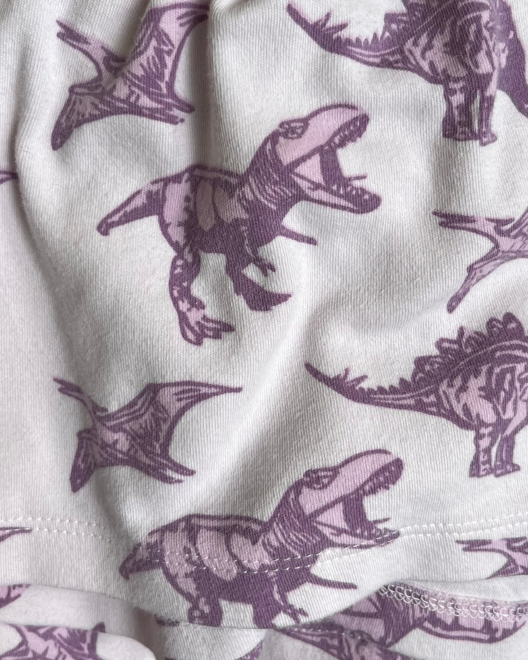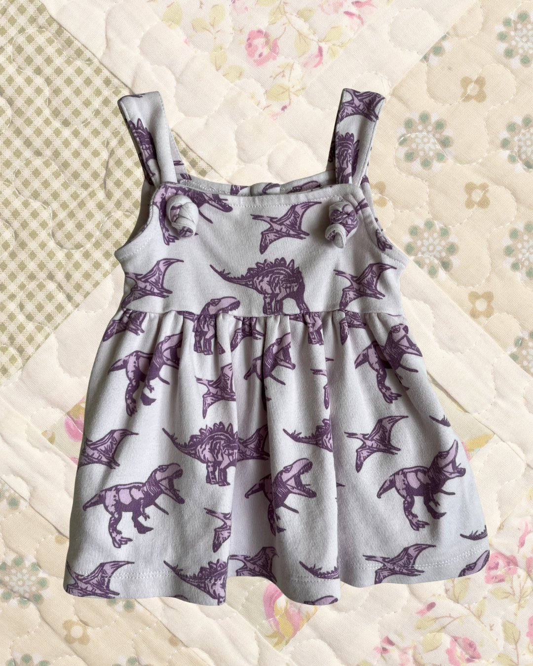 Look at this darling purple dinosaur print dress! It hilariously has pockets. 100% organic cotton.