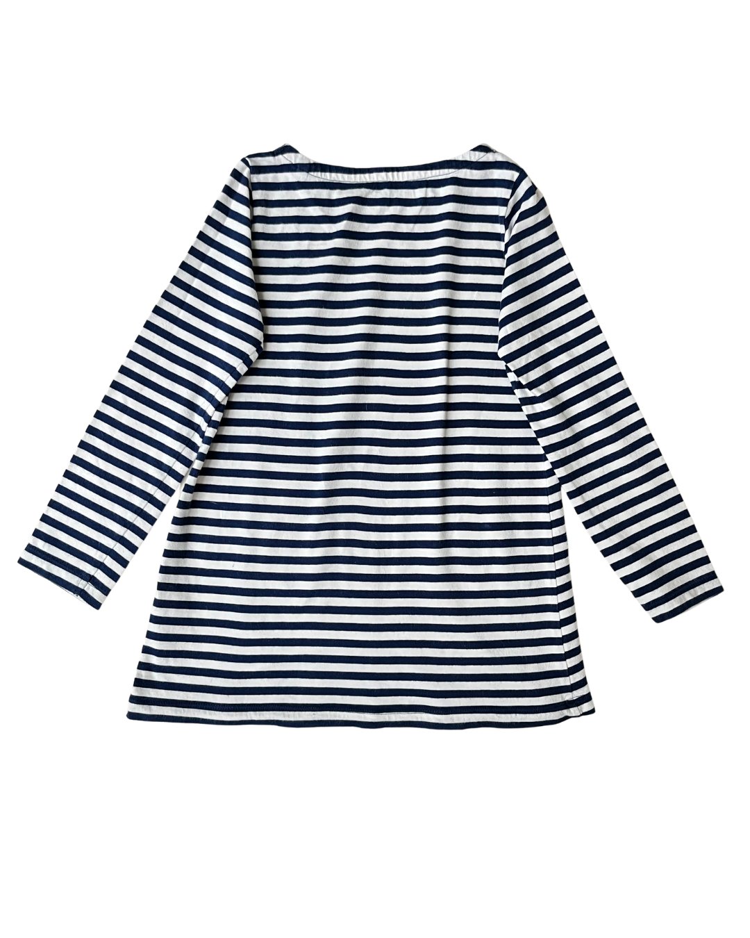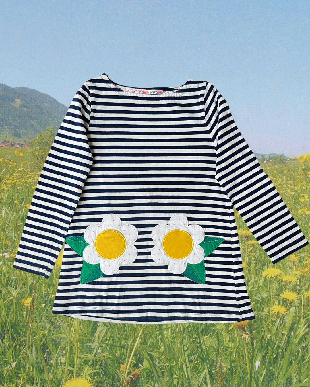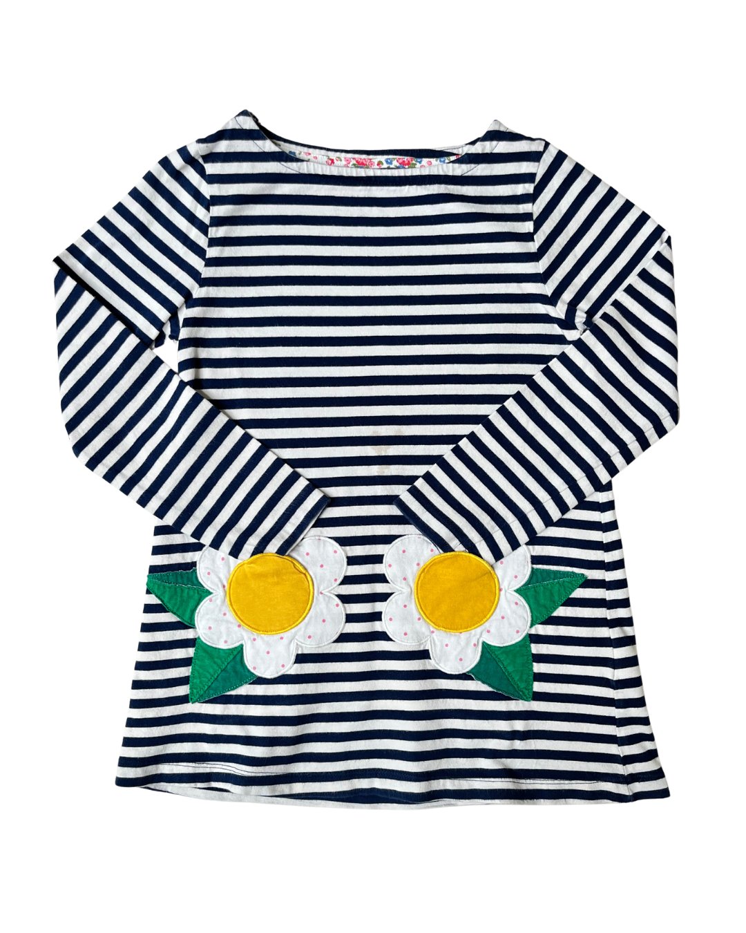 Navy striped Mini Boden A-line jersey cotton tunic with mini functional floral applique pockets. 100% cotton.