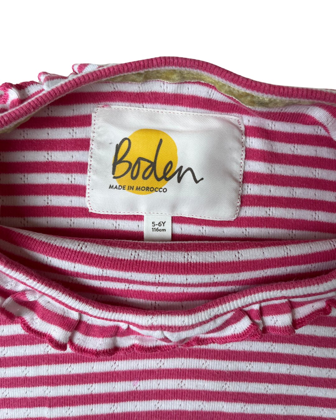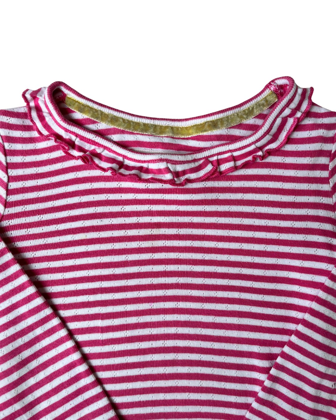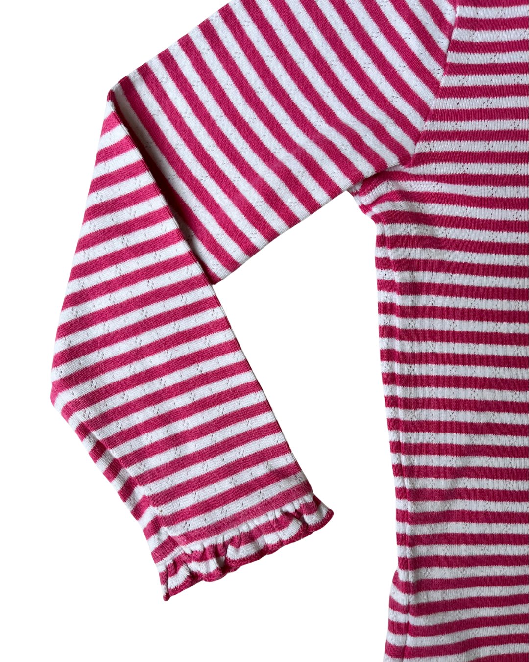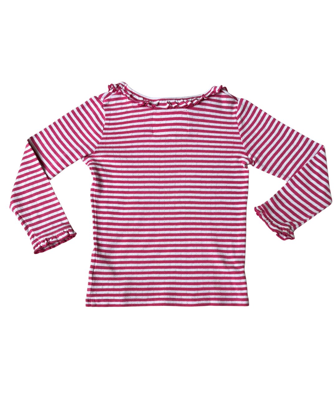 Mini Boden pink striped long sleeve with ruffle collar and ruffle sleeve hems, in an adorable eyelet cotton fabric. Snag in fabric on sleeve, see photos. 100% cotton.