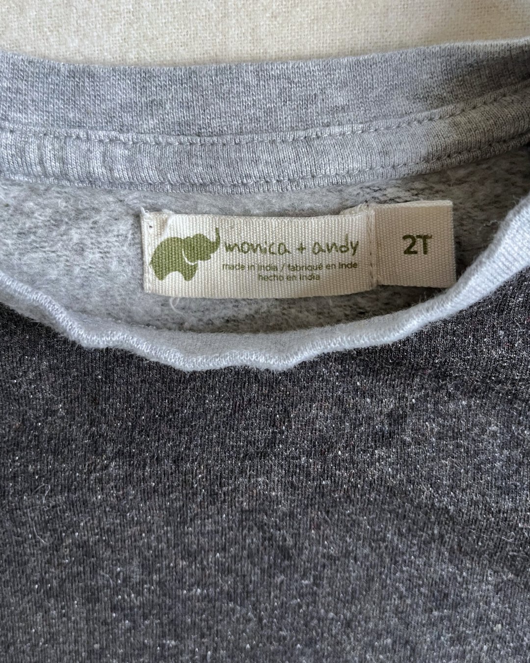 Grey crewneck sweatshirt from Monica + Andy, soft lining on the inside. Tiny snag on back, see photos. 100% organic cotton.