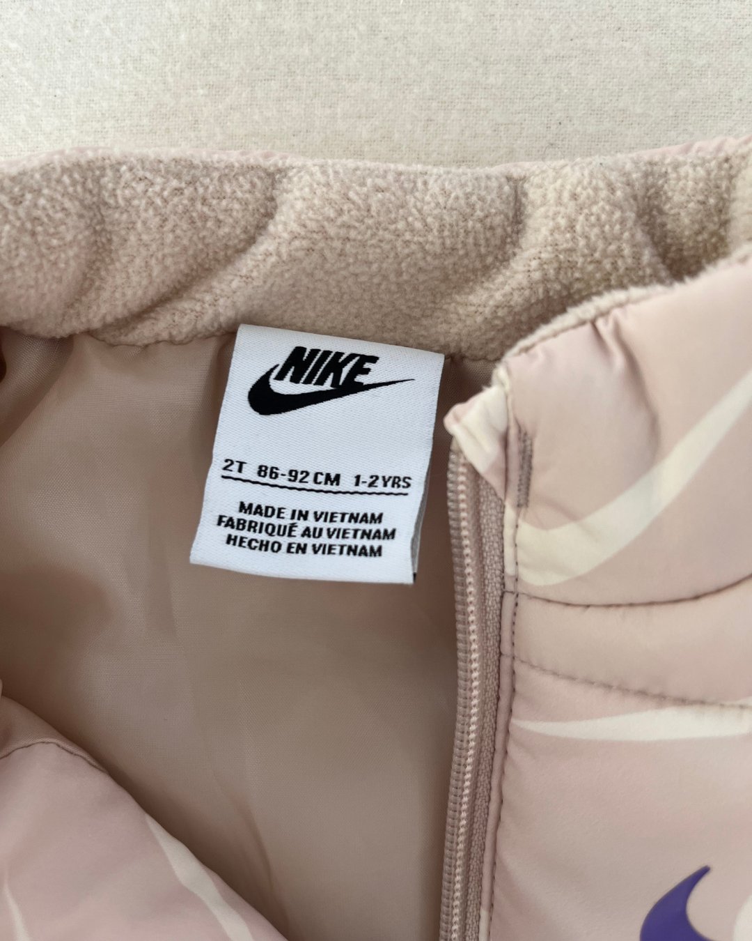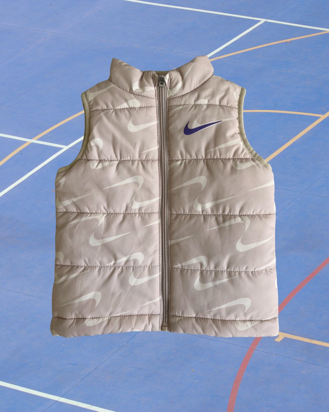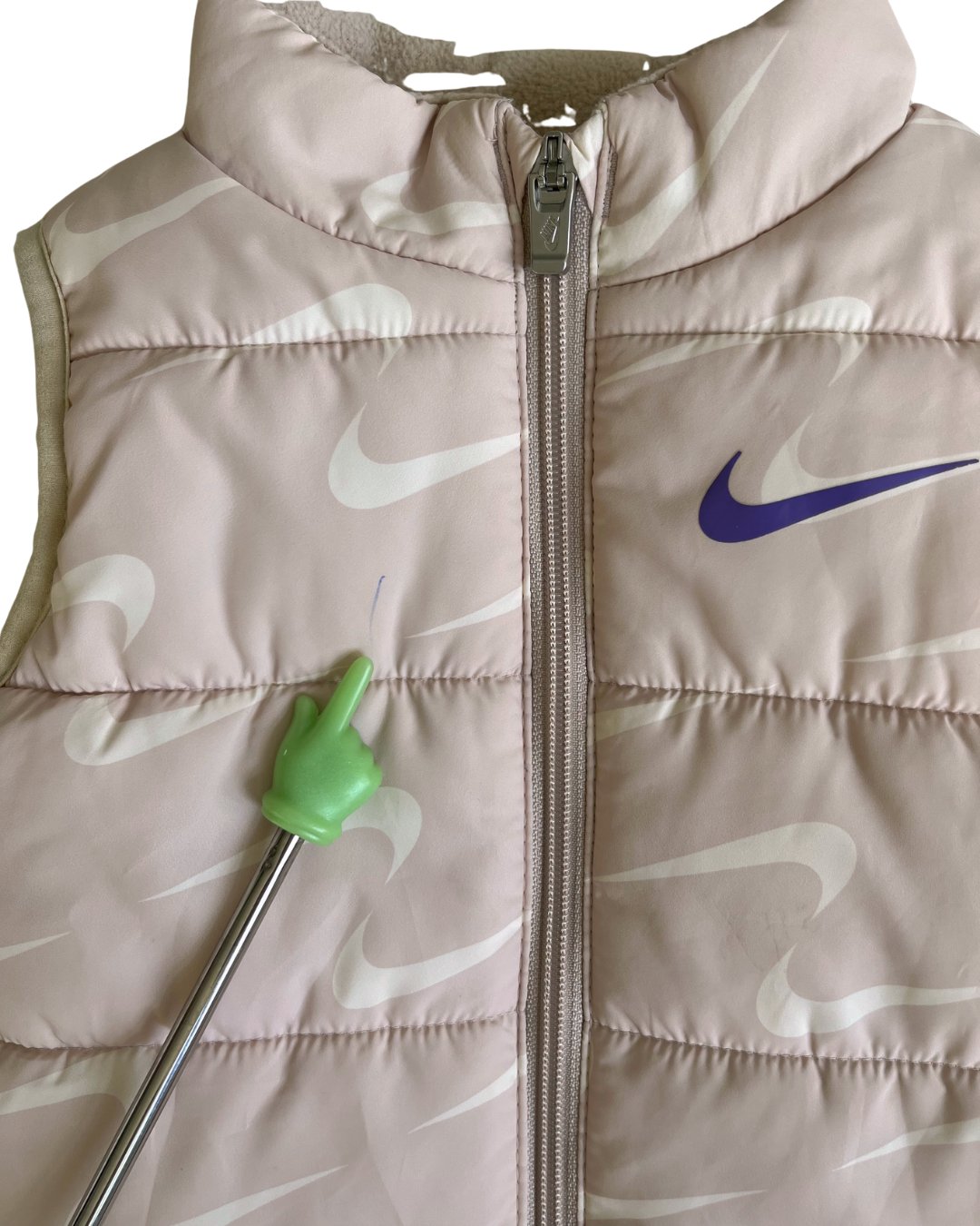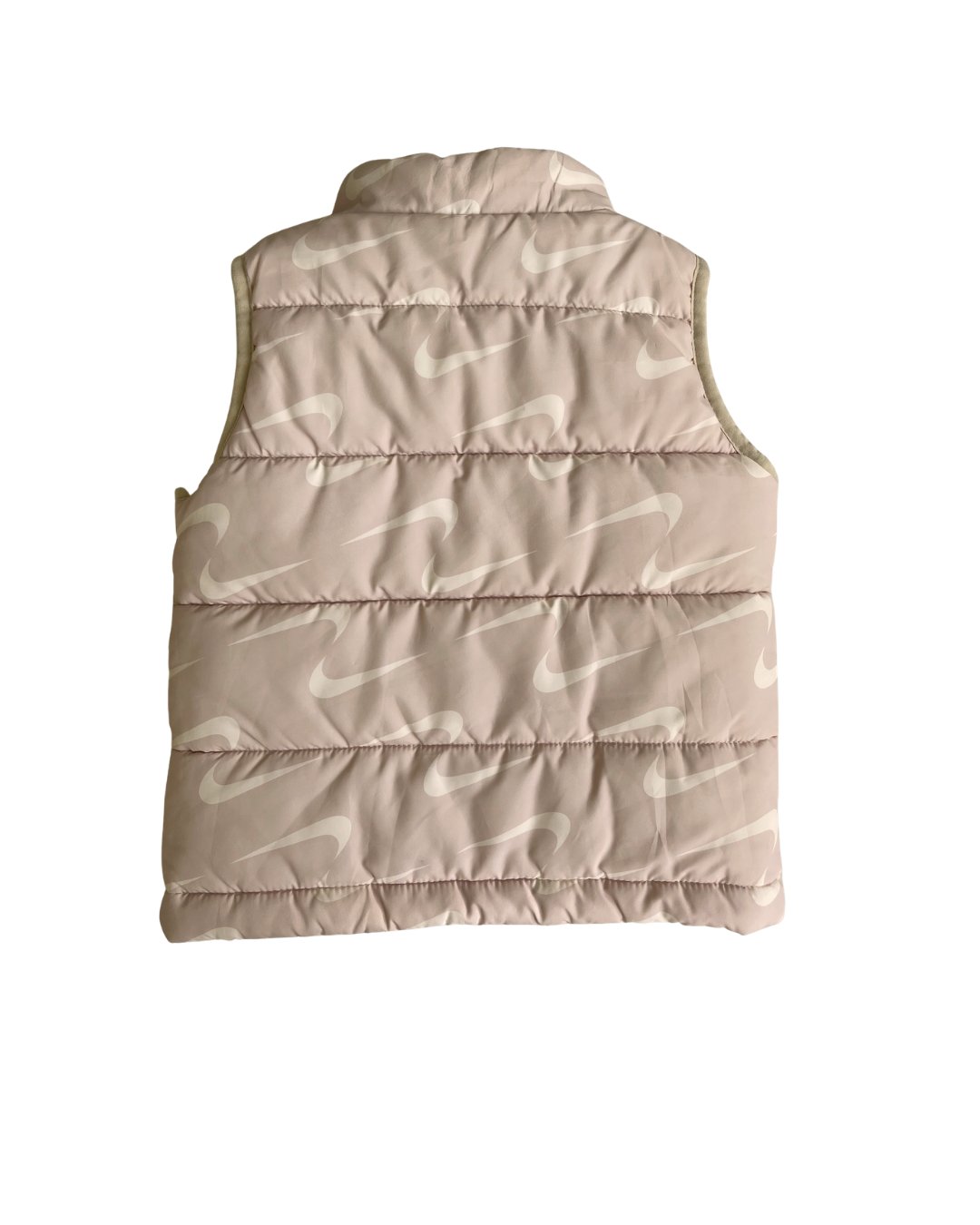 Cream swoosh print Nike puffer vest. Pen mark on front, see photos. 100% poly.