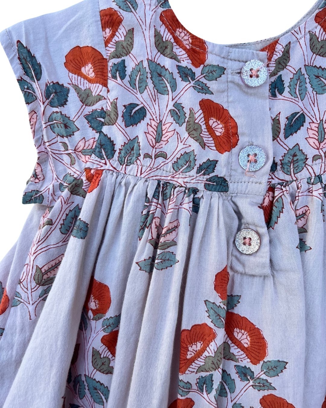 Beautiful taupe dress with floral pattern from Pink Chicken. Softy, flowy, ruffly, perfect! 100% cotton.