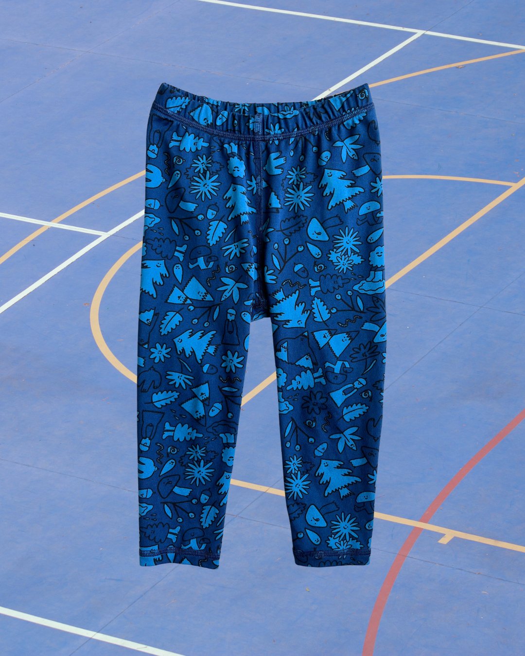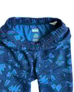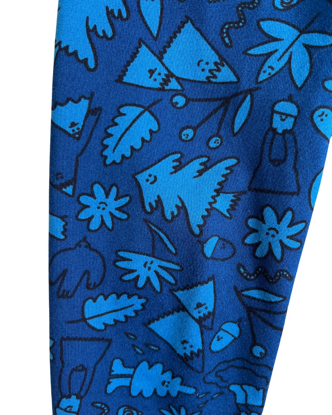 Cute, blue nature cartoon print leggings from REI. 82% poly, 18% spandex.