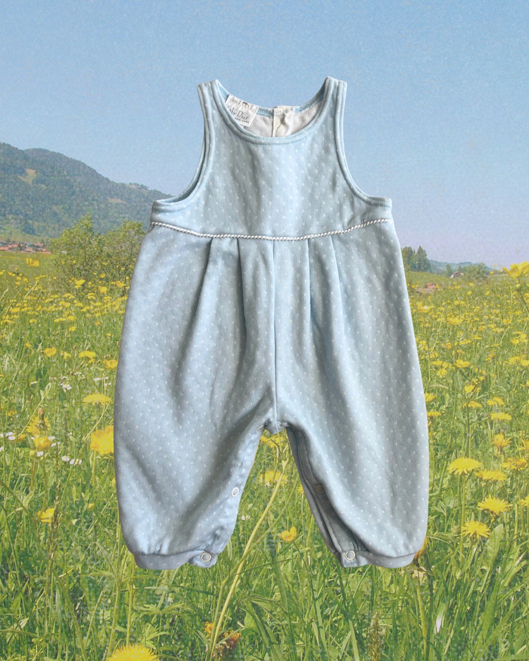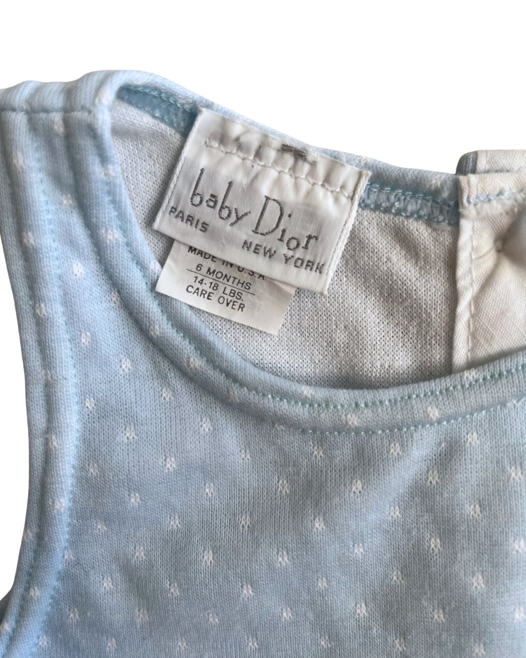 A stunning GEM. Vintage baby blue, Baby Dior romper. Made in the USA. In excellent condition. 50% cotton, 50% poly.