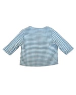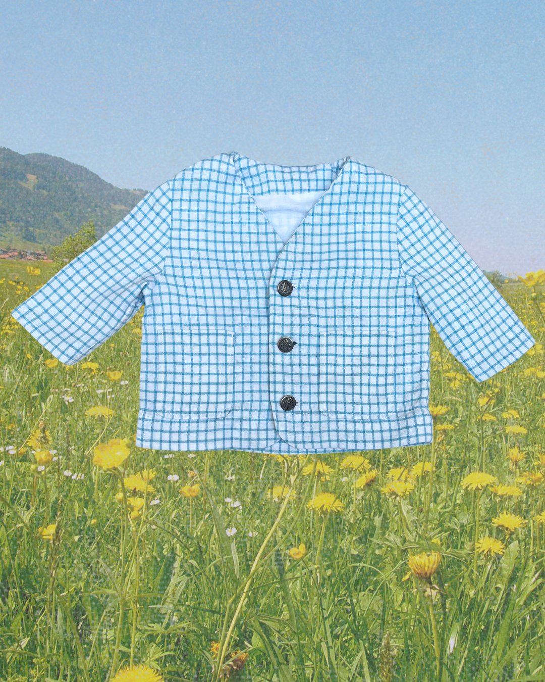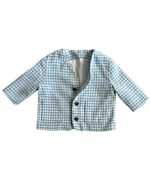 Lightweight, vintage blue checkered blazer with brass buttons. Rust stain underneath top button, see photos. Estimating it at 9-12m, see measurements. Cotton.
