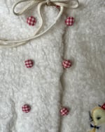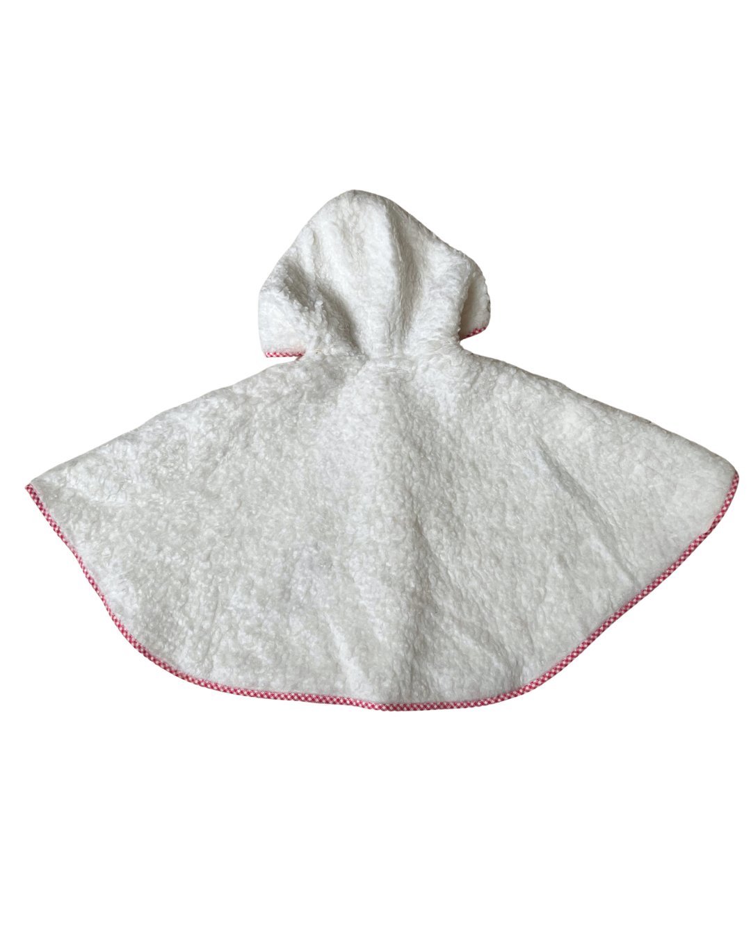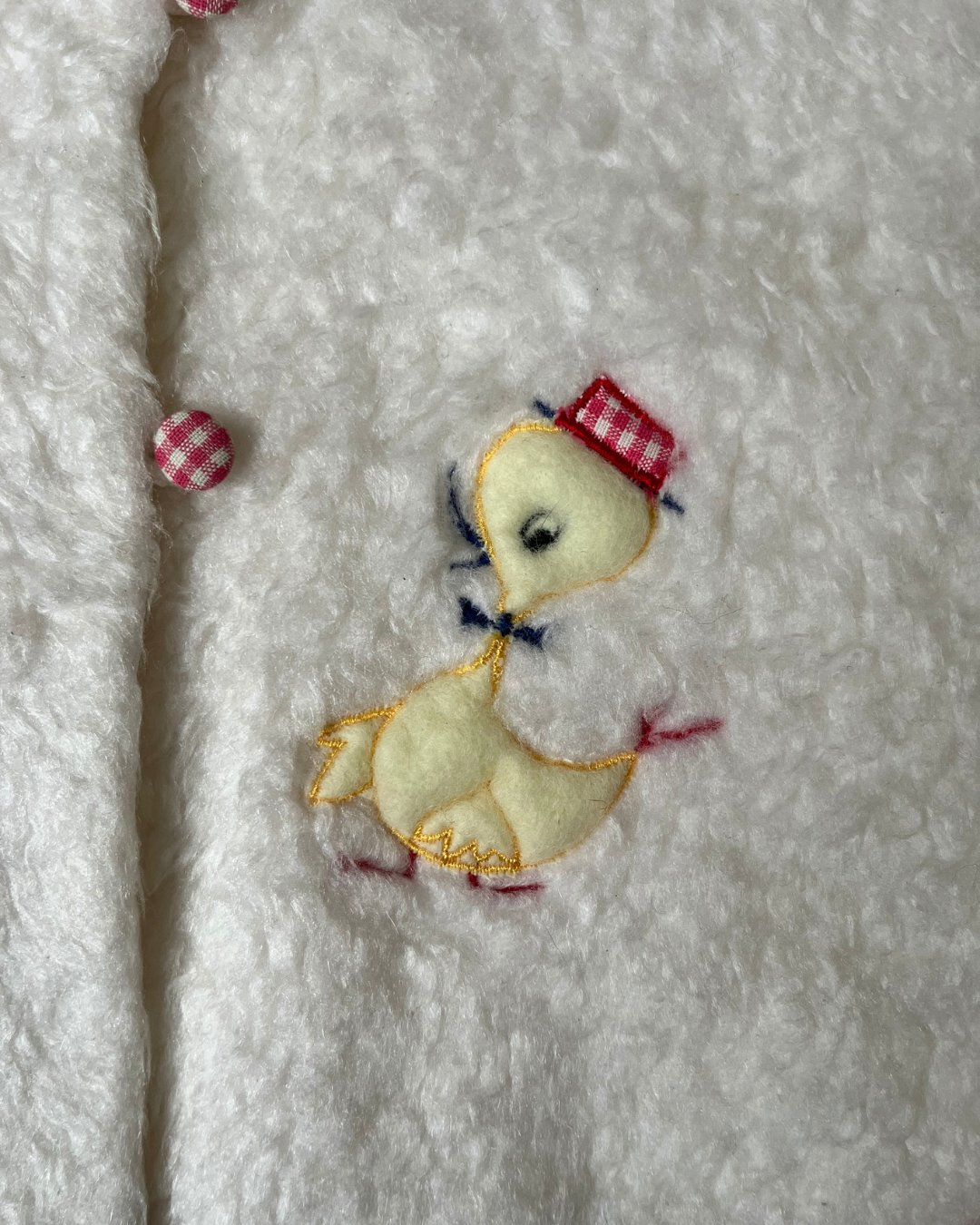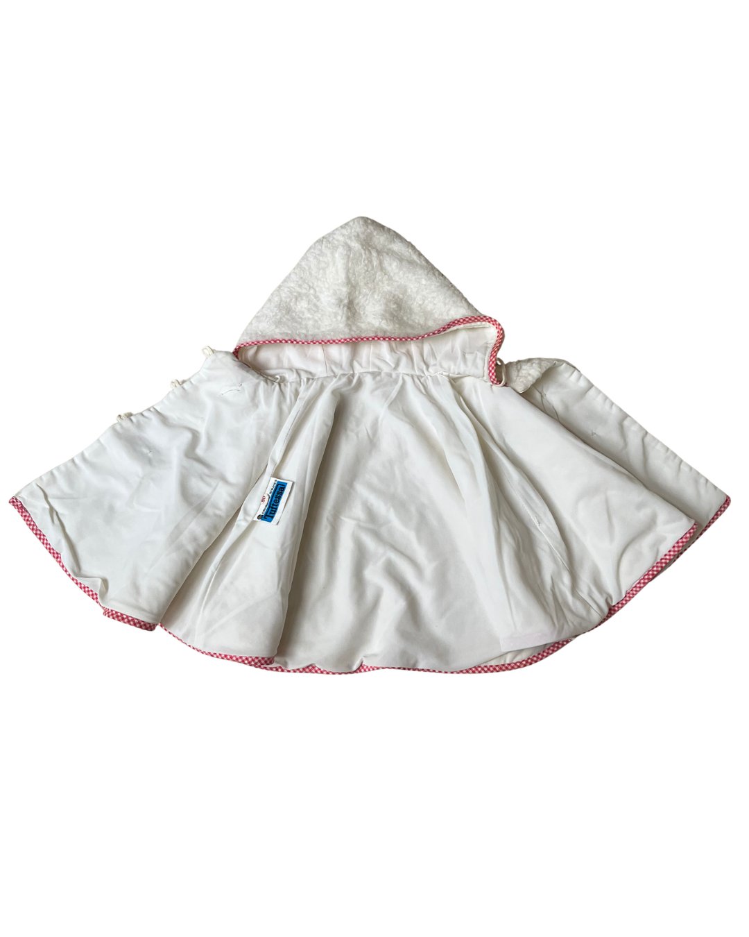 Ok stawwp with this vintage white Tuftessa fleece poncho with a cutie duck detail and drawstring adjustable hood. Gingham detail around the edges and on the buttons. They just don't make them like this anymore! Small staining on ends of drawstrings, see photos. Please note, drawstring will be removed but included. I cannot legally sell a children's clothing item with a functioning drawstring attached.